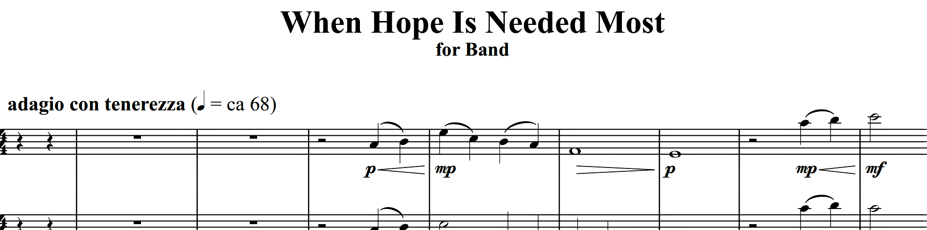 When Hope Is Needed Most, originally written for brass quintet, is an attempt to illustrate the process of finding hope in a time of need. The melody featured in the euphonium section is meant to be a catalytic speech that restores the ensemble’s hope, leading it to grow for the remainder of the piece.